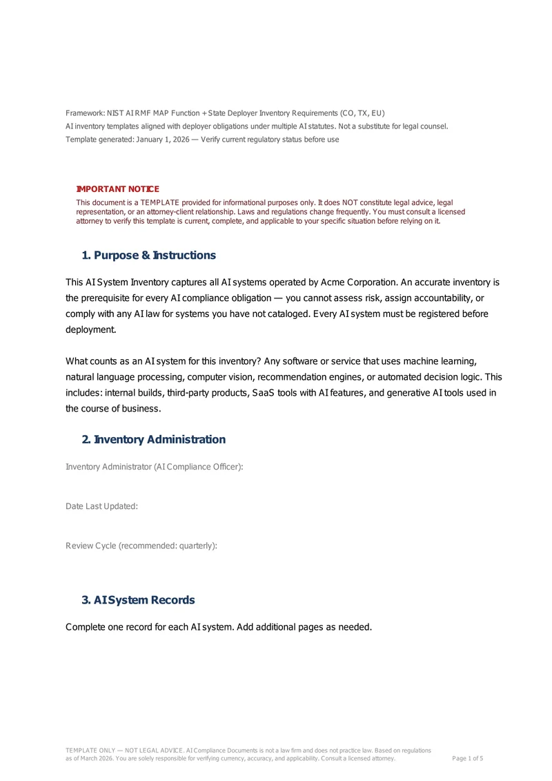 AI system inventory is a prerequisite for compliance with CO SB24-205, TX TRAIGA, EU AI Act, and other AI statutes requiring deployers to assess and document each system. Templates, not legal advice.
