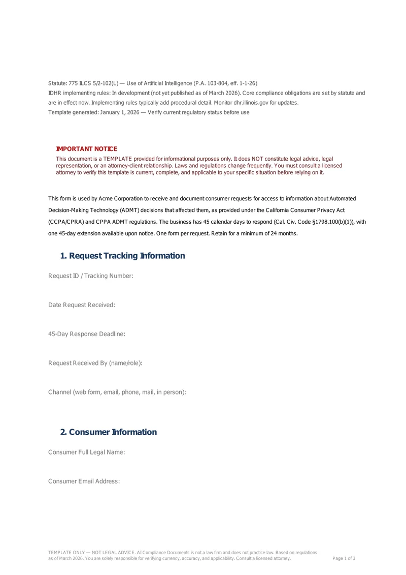 When California consumers exercise their right to know how ADMT was used in decisions about them, you need to explain the logic, key parameters, and output. This kit gives you the intake form, explanation template, and response timeline tracker.