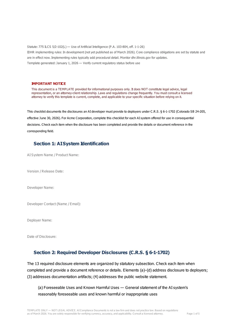 Colorado's law requires AI developers to provide specific documentation to deployers — including model cards, dataset cards, and impact assessment artifacts. This kit standardizes that exchange with checklists, gap analysis, and contract language.