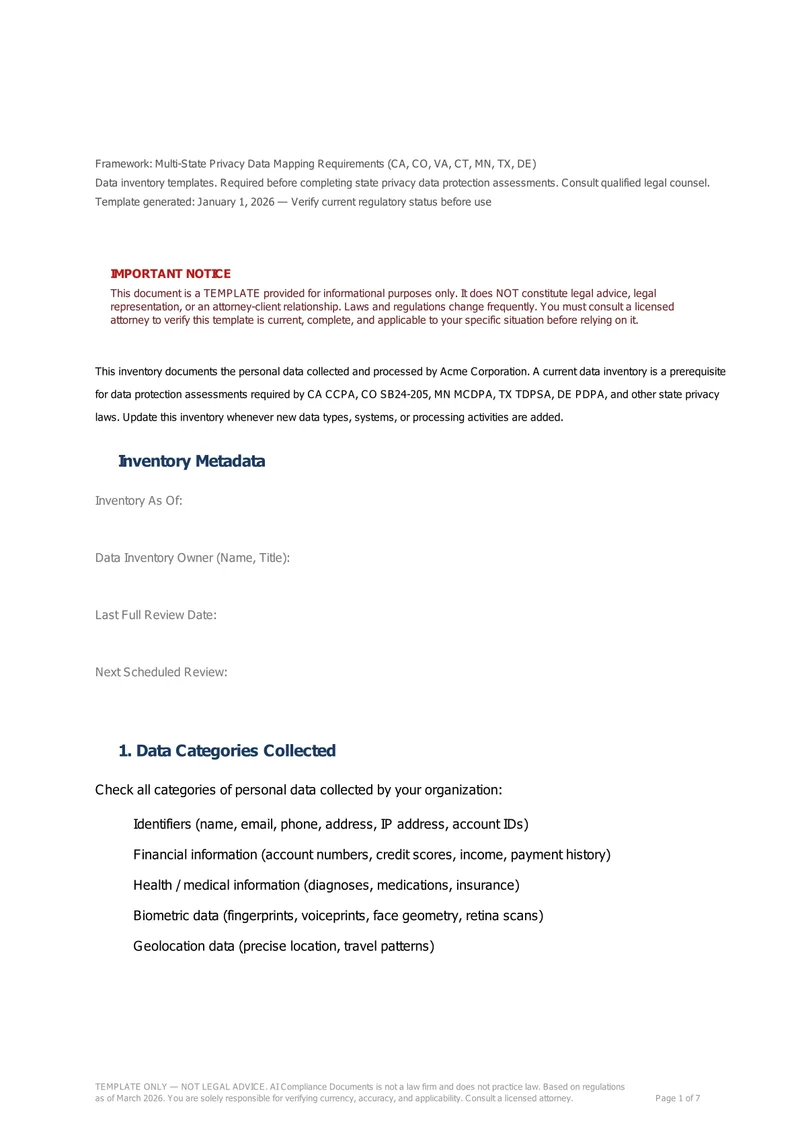 Data mapping is a prerequisite for data protection assessments required under CA CCPA, CO SB24-205, MN MCDPA, TX TDPSA, DE PDPA, and other state privacy laws. Inventory templates, not legal advice.