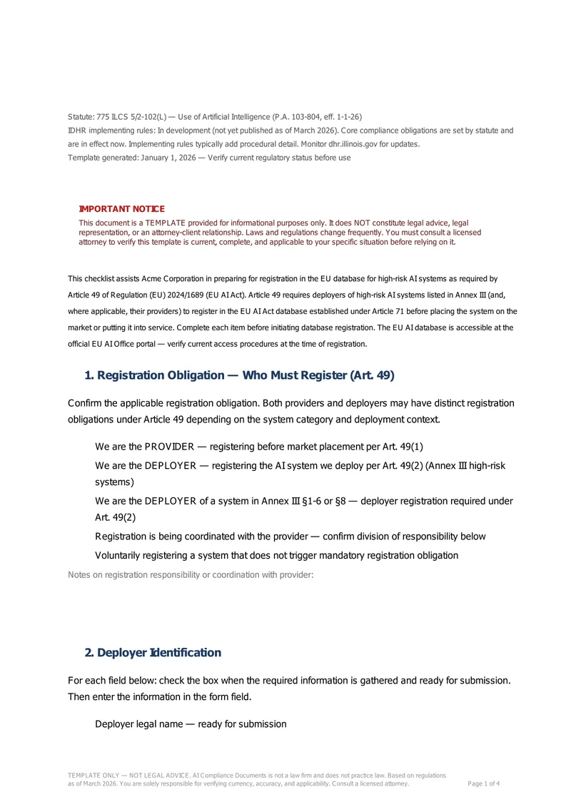 Sample page using demo data. Your documents will include your company name, AI systems, and compliance details.