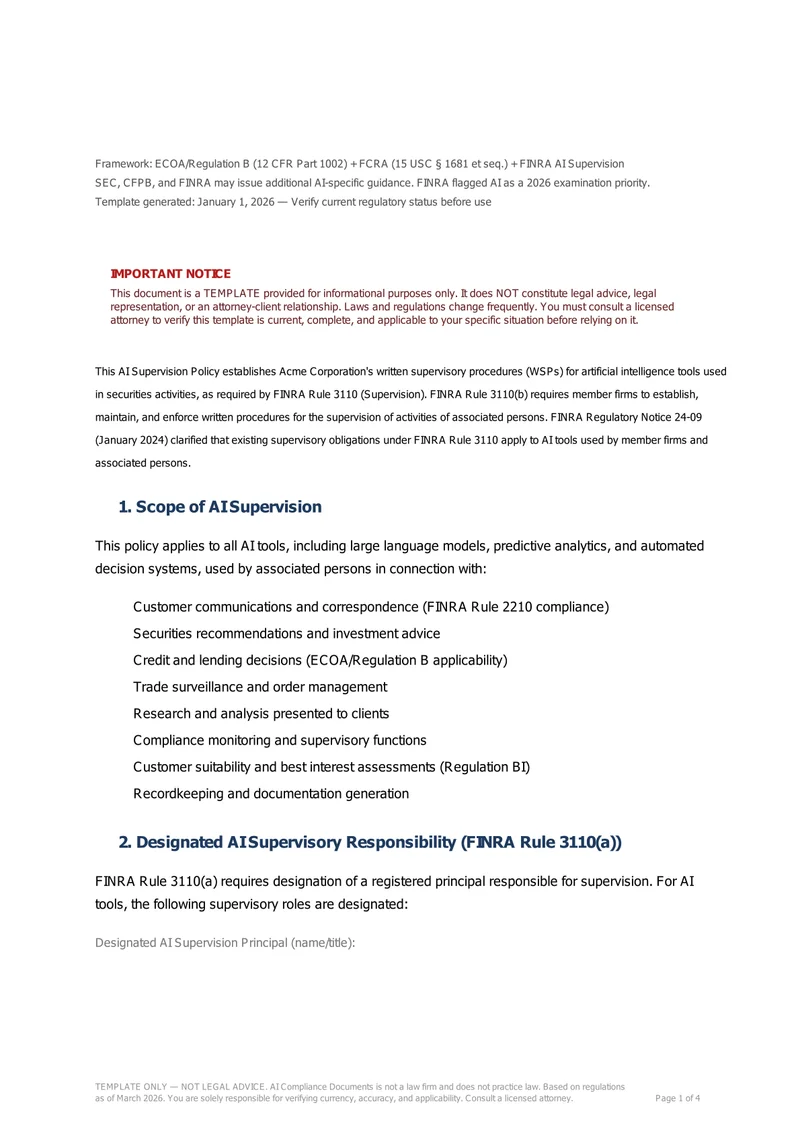 Financial services firms using AI face overlapping requirements from FINRA, the SEC, and the CFPB. This package covers AI supervision documentation, adverse action notices, and model risk management — built for the regulatory environment you're actually operating in.