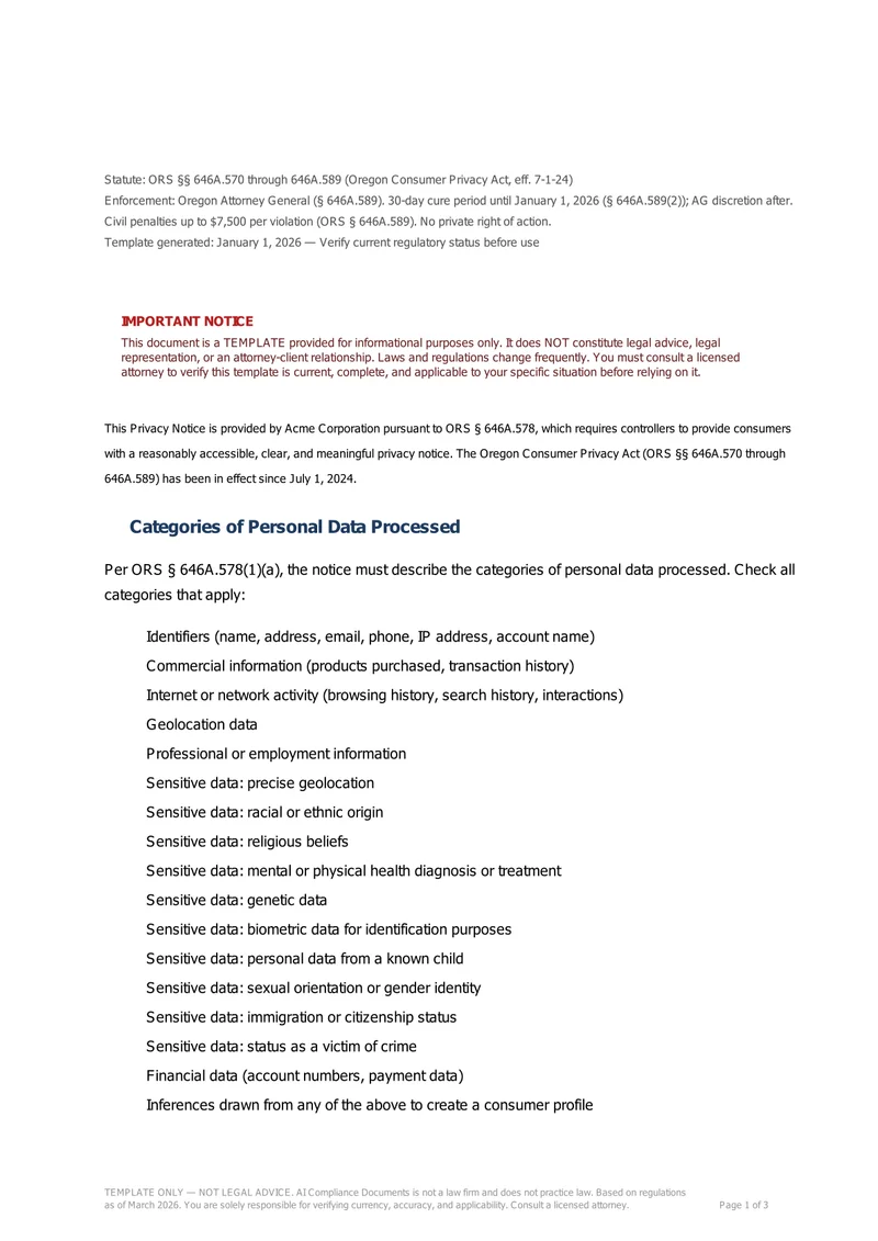 Oregon's Consumer Privacy Act requires data protection assessments for profiling that presents risk of harm to consumers. If your business processes personal data from Oregon residents, this package covers the assessment and privacy notice requirements.