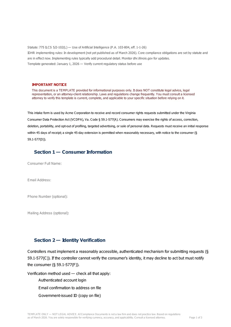 Virginia's CDPA gives consumers 5 distinct rights with a 45-day response window and a formal appeal process. When someone exercises a right, you need a documented intake, response, and — if you deny the appeal — an AG complaint referral notice. This kit covers the full lifecycle.